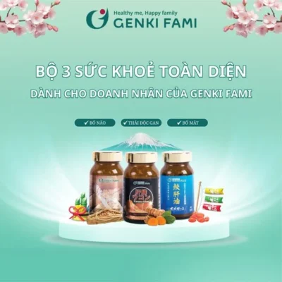 Genki Fami tự hào mang đến Bộ 3 Sức Khỏe Toàn Diện gồm Kanzo Ukon, Natto Ichou, và Omega 3 – những “người bạn” đắc lực giúp các doanh nhân vượt qua áp lực công việc, duy trì năng lượng và đạt được thành công vượt trội.